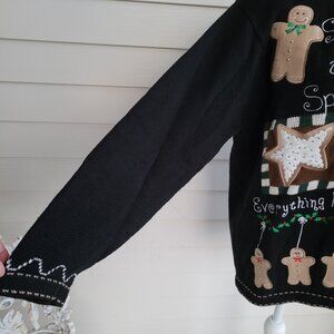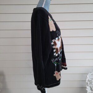 This super cute cardigan sweater is from The Quacker Factory. It is tagged a large but fits big. Materials are 55% Ramie, 45% Cotton decoration, 56% Nylon, 40% Angora rabbit hair, and 4% Lambswool. It has a Christmas holiday theme featuring gingerbread cookies. Main color is black.