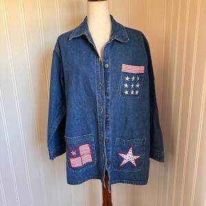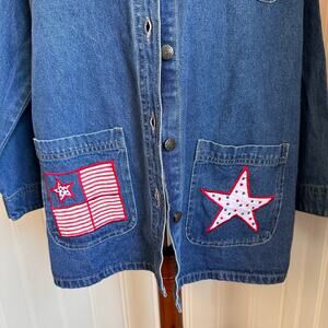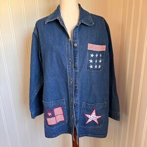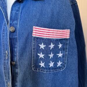 This vintage 90s/Y2K Michelle-Louise denim jacket is a size medium. This blue jacket has an americana theme and buttons down the front. It's cotton and machine washable. This jacket has twee vibes and is in good vintage condition.