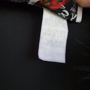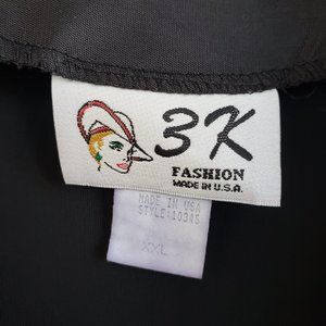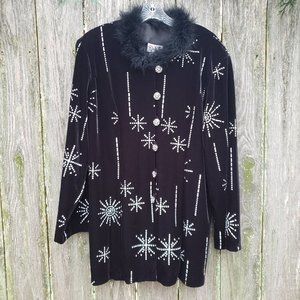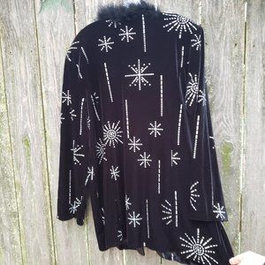 This cute cardigan is a stretchy black velvet with a feather trim around the neck and a sparkly painted snowflake design. It is tagged a size 2X. Brand is 3K Fashion made in USA. Material is stretchy and it has shoulder pads. Also, has some fancy buttons. It is in nice condition. I do not see any issues.