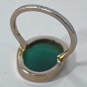Beautiful large statement ring featuring natural faceted green jadeite in elegant oval cut (20mm x 14mm). Two-tone sterling silver with gold plating creates luxurious look. Perfect for jadeite collectors, green gemstone lovers, vintage jewelry enthusiasts, or anyone who loves large faceted statement rings. Good condition, some gold finish wear on reverse side.