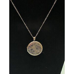 Design: Round locket with deeply etched foliate/scrollwork front.