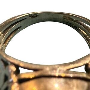 Design: Ornate filigree scrollwork with bezel-set carnelian Condition: Pre-owned with surface wear and minor scratches, adding to its vintage character.