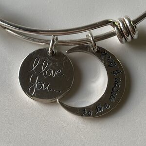 Vintage 925 Sterling Silver Slider Bangle Bracelet Charms I Love You To The Moon & Back Charms. Weighs 13.44g, made in Thailand by Extraordinary Life. This is a slider bracelet and thus you slide it wider to fit over your hand.