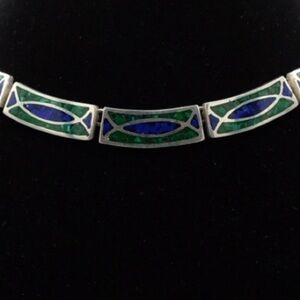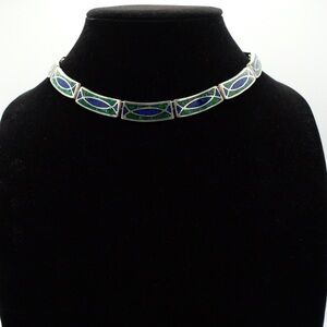 Stunning vintage chocker necklace featuring vibrant blue and green stone inlay in geometric pattern. This eye catching piece sits beautifully at the neckline and is perfect for fans of retro, minimalist, or statement jewelry.