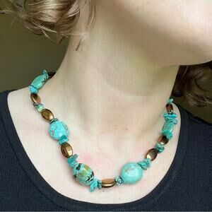 Vintage 925 Sterling Silver Chunky Genuine Turquoise and Bronze Bead Necklace C3