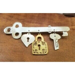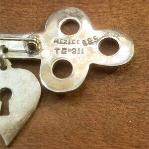 Vintage 925 Sterling Silver Heart Lock & Key Brooch Mexico TC 2-11 3.5"x2"