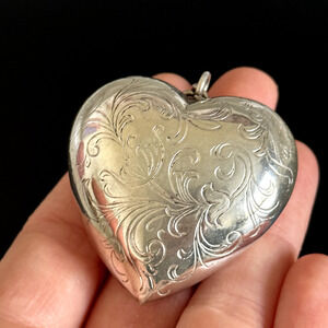 Vintage 925 Sterling Silver Large Puffy Heart Floral Scroll Etched Pendant