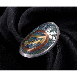 This striking piece is crafted from sterling silver (925) and showcases the traditional Mexican mastery of mixed-metal inlay. The surface is decorated with copper and brass details, set against a mosaic background of azurite and malachite stone chips—a vibrant mix of greens and blues symbolizing the land and sky.