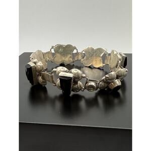 A beautiful and handmade vintage bracelet measuring approx. 7.5 inches. Four onyx warriors along with cabochon onyx insets linked with sterling. Stamped with "Sterling" and makers mark that is too worn to be identified. It is Mexican as recognized by the design. This piece is likely early 20th century. A beautiful example to add to your collection.