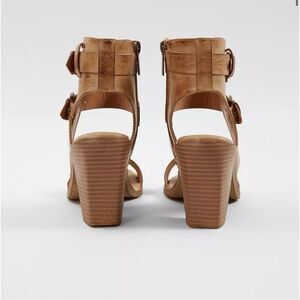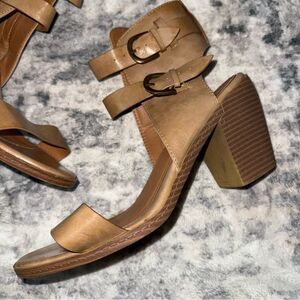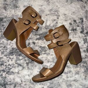 Sophisticated tan sandals with sturdy block heels. Features stylish buckle straps. Ideal for versatile wear.