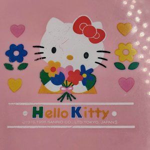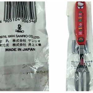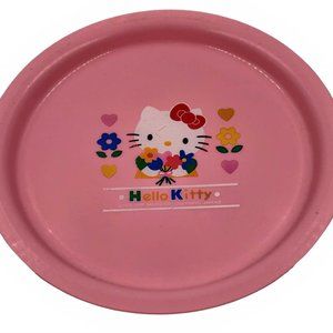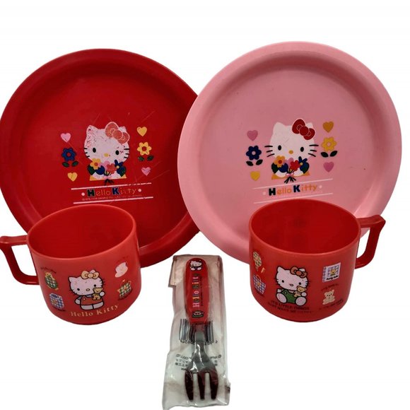 Vintage 94 96 Hello Kitty Sanrio Set 2 Red Pink Plastic Plates 2 Red Cups 1 Fork Good vintage condition, the plates and cups have wear, the graphics do have fading/scratches, the single fork is new in package Plates are approximately 6.75" across and cups approximately 2.5" tall