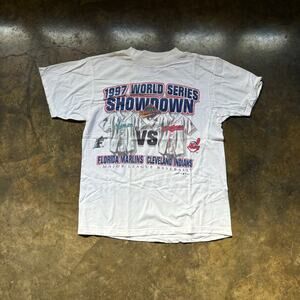 Vintage 97 World Series Rivals Marlins Indians T-shirt 18.5x25 Size Medium Vintage 1997 World Series Rivals T-shirt featuring the Florida Marlins and Cleveland Indians.
