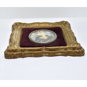 This piece is about 6.5" wide x about 7.25" tall x about 1" deep. The frame is a painted wood. The front has a burgundy - plum velvet.