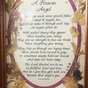 This vintage framed artwork features beautifully pressed real flowers and a powerful "A Human Angel" quote. Perfect for tabletop display or wall decor, it adds a charming touch to any space.