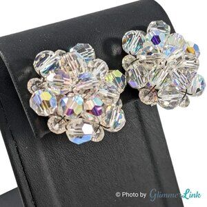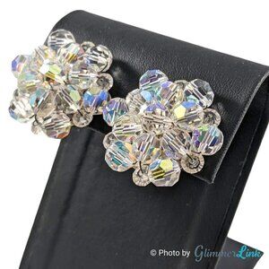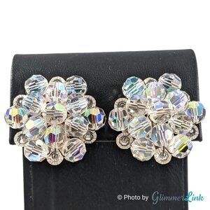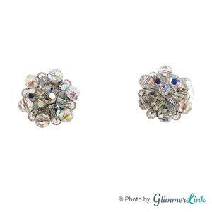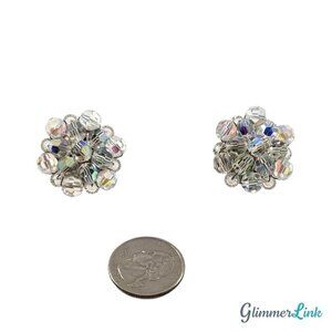 Vintage silver tone clip on earrings featuring a cluster of aurora borealis beads.