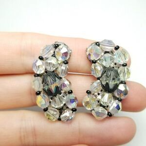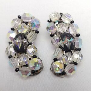 Vintage AB Glass Bead Cluster Clip On Earrings, Black Accents, Kidney Shape