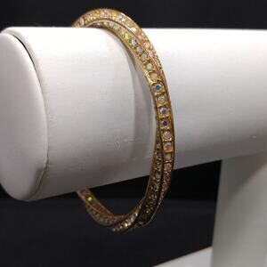 *Description: This is a beautiful aurora borealis rhinestone gold plated bangle bracelet with a twisted design from the 1980s. Each rhinestone is in place and full of sparkle. It is 8 inches around the inside so your hand fits through without any opening. Due to the twisted design, the rhinestone sparkle in all directions as you move. This would be a great addition to your vintage jewelry collection or make a great vintage gift!