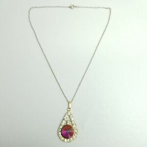 Vintage AB Rainbow Rhinestone Drop Shape Pendant Necklace, Silver Tone Chain