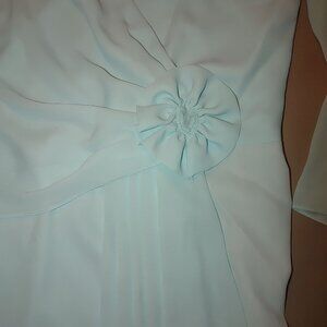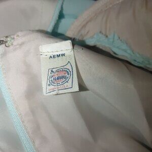 This vintage AEMW dress from the USA features a delicate light blue wrap style with a floral detail at the waist. The long sleeves and back zipper provide a timeless elegance.