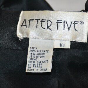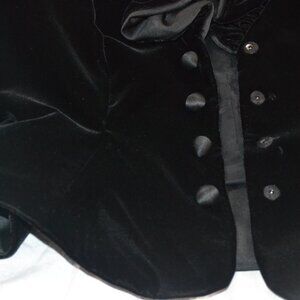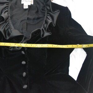 Very good condition Vintage (1990's) AFTER FIVE black velvet formal, cocktail, evening jacket blazer. Size 10. The jacket features a satin lined ruffle and satin covered button (snaps). Beautifully lined. Very well-made jacket. Gorgeous with slacks or a skirt. No rips, tears or stains. This velvet feels divine!