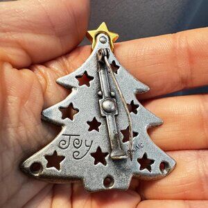 Vintage AJMC Christmas Tree Brooch Joy Cutout Stars Signed Holiday Pin 2 Inch