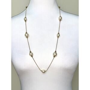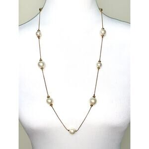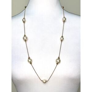 Vintage AKD Gold Tone Faux Pearl Station Long Necklace