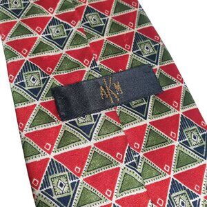A sophisticated addition to any wardrobe, this vintage AKM tie features a geometric pattern in festive red and green tones. Crafted from luxurious silk, it offers a touch of elegance and style for the modern professional. Measuring 57 inches, this tie is suitable for various formal events.