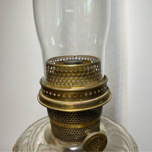 Elegant vintage glass oil lamp featuring intricate brass accents. Perfect for adding a classic touch to any room.
