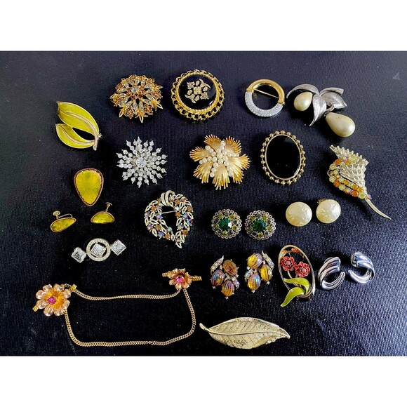 This vintage 20 piece rhinestone jewelry lot features pieces from top brands such as Weiss, Florenza, Coro, and Crown Trifari. Each piece is adorned with multicolor rhinestones, making for a glamorous and eye-catching collection. Perfect for women who appreciate vintage fashion, this lot offers a mix of stunning pieces that are sure to add a touch of elegance to any outfit.