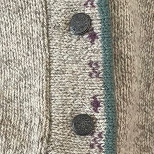 Vintage wool sweater with purple and green trim, brass flower buttons. ALPS Rugged Outdoors.