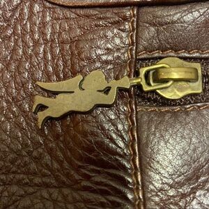 •Antique brass hardware featuring angels on all zippers