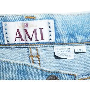 Step into timeless style with these vintage AMI jeans featuring a flattering high-rise fit and tapered legs. Crafted from 100% cotton in a light wash, they offer classic 5-pocket styling with a zip fly and button closure. Tagged size 14L. Style #20061L. Made in Macau.