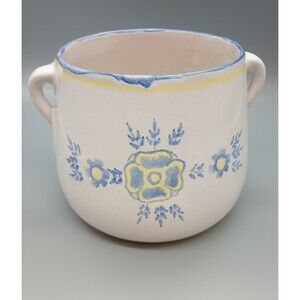 Vintage AMNION Clay Pottery Handpainted ALGARVE Blue Yellow CROCK w Two Handles
