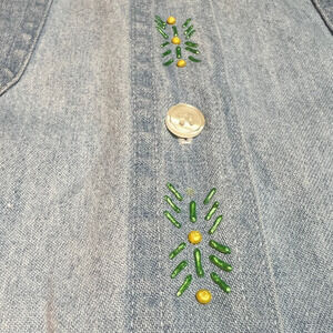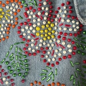 Vintage AMRAV The American Rave Chambray Denim Floral Puff Paint Short Sleeve Button Down. The embellishment runs down the button placket and also halfway across the collar. Two flap pockets. There seems to be only 1 puff missing, all other paint seems to be intact, please see images. No size tag, it's faded, but it's measuring a size M, please see measurements below. Single stitch. Nice, wide cuffs.