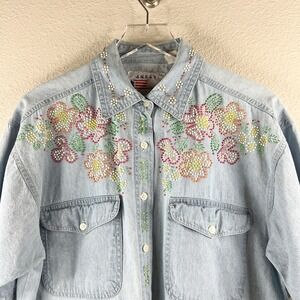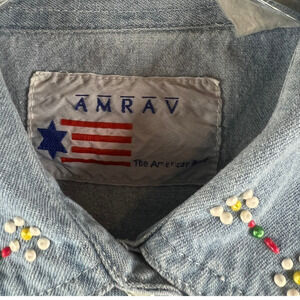 Vintage AMRAV American Rave Chambray Floral Puff Paint Short Sleeve Button Down