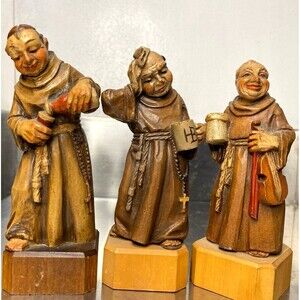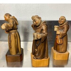 This rare set of 3 vintage Anri carved wooden Friar monks is a stunning showcase of Italian craftsmanship. Each piece is hand-carved, featuring intricate detailing of monks engaged in different activities: holding a rosary, a beer mug, and a violin. All three figurines are signed on the bottom, confirming their authenticity as Anri collectibles. Perfect for collectors or as unique rustic décor.