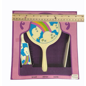 Vintage ARC 1980 Hair brush comb and mirror vanity set. Features a rainbow with clouds and stars theme. New Old stock sealed. ARC New York. Unknown manufacturing place, not noted on packaging. Drugstore type set. Packaging may be discolored/slightly warped. Never used or opened. Great vintage vanity set collectible! Ships in box for protection.