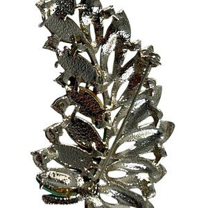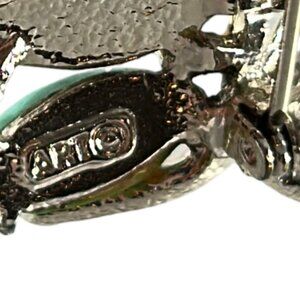 Vintage ART Aqua White Rhinestone Leaf Brooch Silver Tone Pin Enamel in good preowned condition. Measures about 3.5" long.