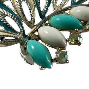 Vintage ART Aqua White Rhinestone Leaf Brooch Silver Tone Pin Enamel