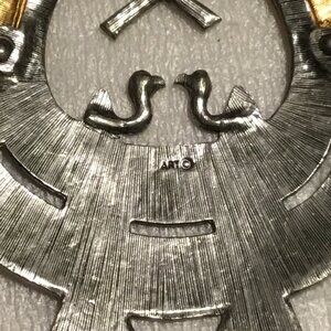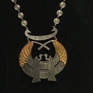 This is a great big silver and gold tone Egyptian Revival Goddess Necklace, featuring vulture-like birds, etched with little cryptic designs and a medallion link chain. The necklace measures approximately 18 1/2 inches long and it is signed on the back with ART, for the designer and creator Arthur Pepper who started the Mode-Art jewelry company in New York City in the late 1940s. The name eventually was shortened to ART. This piece is absolutely gorgeous. It is in very nice pre-owned condition as you can see in the pictures. Some of the medallion like discs have some rusting, so they may need some cleaning. Even so, this is still a very lovely piece and a nice addition to any collection. There is one on Ebay just like it, selling for $149.00. This one is up for grabs for much less. Thank you for looking and please feel free to make an offer on anything you like. 😊