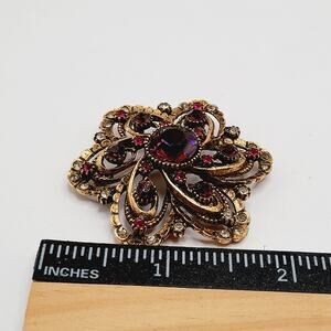 Beautiful vintage ART by Arthur Pepper brooch featuring layered gold-tone metalwork and sparkling rhinestones in shades of deep purple, pink, and clear. The design forms an ornate floral motif with intricate textured detailing and prong-set stones that catch the light from every angle.