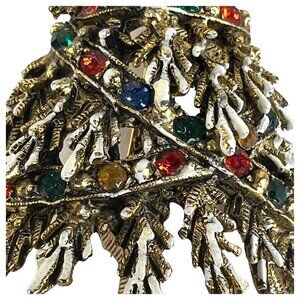 A vintage brooch designed by ART in the shape of a Christmas tree, adorned with colorful rhinestones. Ideal for holiday attire.