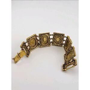 Vintage ART Signed Gold Tone Photo Locket Panel Bracelet Victorian Revival