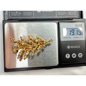 A bold and beautiful vintage Christmas tree brooch from the renowned designer Art (Arthur Pepper). This substantial piece showcases the brand's signature style, with a highly textured, coral-like gold-tone finish. The tree is lavishly decorated with colorful round rhinestones, red 'ornament' cabochons, and sparkling clear baguette 'candles'. Topped with a rhinestone star, it's a classic and highly collectible piece of designer holiday jewelry. Fully signed 'ART ©' on the reverse. Please note the condition before purchasing.