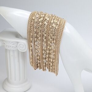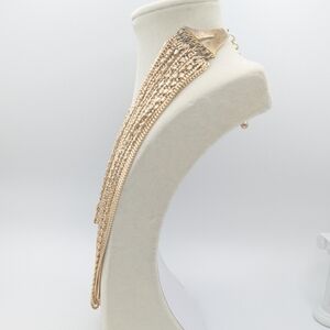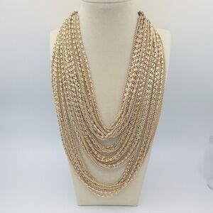 Necklace: 40 total mixed style dainty chains in very lightweight gold tone metal draped in a statement layered bib style, shepherd's hook closure
