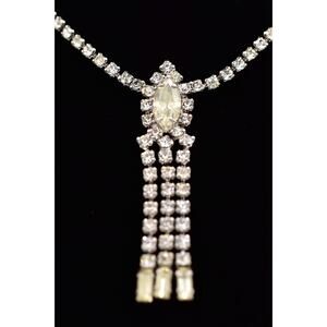 A glamorous vintage ASTRA rhinestone necklace featuring a marquise-cut center stone and elegant triple-strand tassel drop. Sparkling clear round and baguette stones create a refined, Old Hollywood look—perfect for weddings, evening wear, or collectors of mid-century costume jewelry.