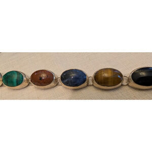 Vintage sterling silver multi-gemstone cabochon link bracelet. Features malachite, mahogany jasper, ocean jasper, onyx, tiger eye, and lapis cabochons. Marked ATI / Mexico / 925 on the last cabochon. Measures 7-1/2" in length and 1/2" in width with a weight of 43 grams.