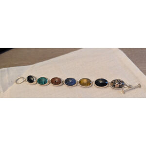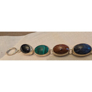Vintage sterling silver multi-gemstone cabochon link bracelet. Features malachite, mahogany jasper, ocean jasper, onyx, tiger eye, and lapis cabochons. Marked ATI / Mexico / 925 on the last cabochon. Measures 7-1/2" in length and 1/2" in width with a weight of 43 grams.