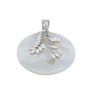 This vintage sterling silver pendant showcases a luminous mother of pearl disc adorned with delicate floral and leaf-inspired silverwork. Its elegant design and handcrafted details reflect timeless artistry, making it a perfect accessory for formal occasions or everyday sophistication. A truly enchanting piece for any jewelry collection.