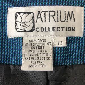 ATRIUM COLLECTION - VINTAGE Teal, Blue & Purple Collarless Classic 80s-90s Button Front Blazer w/ Shoulder Pads & Pockets. Buttons are glossy black inlaid in brassy gold finish. Size 10. No visible flaws. Excellent pre-owned condition. LIKE NEW!